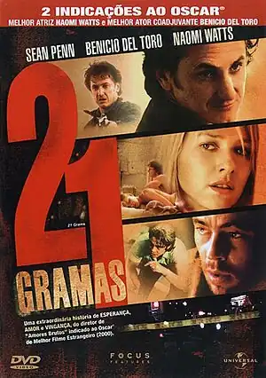 21 Grams is a 2003 American drama film directed by Alejandro González Iñárritu and written by Guillermo Arriaga. It stars Sean Penn, Naomi Watts, Danny Huston, and Benicio del Toro.