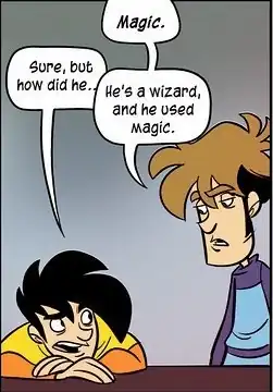 - The full first comic is notable because it features a villain using a magical technique, meaning that a literal wizard was involved. However, the players are complaining on the basis that magic doesn't work like that in their setting. Tycho insisting that you can just say "MAGIC!" is invoking the other form of this trope.