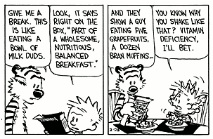 - As pictured above, Calvin eats cereal that takes five grapefruits and a dozen bran muffins to even out the sugar (and possibly more, since Hobbes trails off while explaining this).