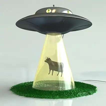 This is actually a great example of a Dead Unicorn Trope. Like Anal Probing, "Cattle Abductions" were never really a trope in the first place; but they've become popular as a sort of satirical combination of Alien Abduction and cattle-mutilation stories. It's also a useful trope for designating aliens that are up to no good, but in a comedic or nonthreatening way (the sight gag of a mooing cow being tractor-beamed up into a flying saucer). Sometimes it's even played as a kind of obsessive-compulsive disorder: they just can't resist beaming the creature up.