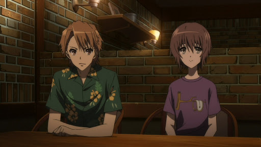 - Breather Episode: Invoked example with the anime's episode 8, which is also a Beach Episode. This comes right after Kouichi himself gets Unpersoned, Mr. Kubodera commits a very public suicide, and very strong evidence arises that Kouichi is the dead student. Everyone is exhausted by the events in Yomiyama, and the downplayed soundtrack and the emptiness of the beach make the entire affair feel like a rather futile attempt to relax in the wake of the recent disasters. Too bad it doesn't last.