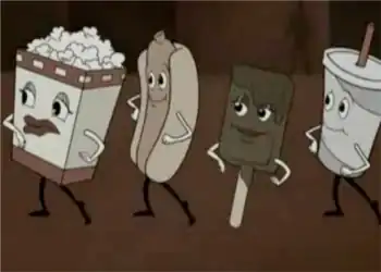 - Singing food from the 1950s Let's All Go to the Lobby movie adverts.
