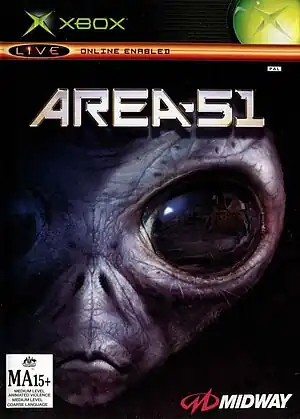 Area 51 is a First-Person Shooter video game using the Unreal 2 engine and released on the PlayStation 2, Xbox, and Microsoft Windows. Based loosely on the 1999 arcade rail shooter of the same name, the game takes place inside the famous Area 51 research facility in Groom Lake, Nevada, where the release of an alien virus has transformed the majority of the scientists and security staff into insane raging mutants. The player takes the role of Ethan Cole, a member of a 4-man biohazard cleanup team sent into the facility to contain the situation. As the game progresses Ethan is eventually separated from his team and ends up uncovering a massive conspiracy between the world-controlling Illuminati and the alien Greys who crash landed in the Nevada desert 50 years ago. Although it didn't do anything revolutionary, it was generally considered a competently made shooter and received mostly decent reviews. In particular, the developers were praised for their attention to detail regarding conspiracy lore. The game is notable for featuring the voices of David Duchovny as Ethan Cole, Powers Boothe as Mission Control Major Bridges, and Marilyn Manson as Edgar the rogue Grey.