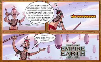 - ↑ High Priest: Yes! With stones of varying sizes! The rocks represent the pinnacle of Modern Warfare! And so long as our rocks are heavier and our sticks pointier, the Gods will favor us! (...) Behold! More gifts from the heavens!
