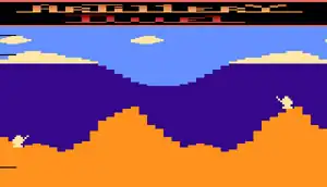 Artillery Duel was a Side View, Player Versus Player, Turn-Based Strategy, artillery game, released in 1983 by Xonox as part of their "Double-Ender" series of two-game Atari 2600 and ColecoVision cartridges. Artillery Duel does what computers were first designed to do back in World War II: calculate artillery trajectories. It was the first successful example of a genre that goes back to the mid-'70s, and includes later hits like Scorched Earth and Worms.