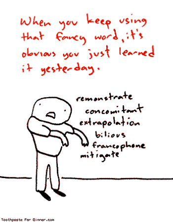 Ever suspect that an author has an idiosyncratic Word-of-the-Day Calendar? Some really unusual, often sesquipedalian, word appears in the text, perhaps not used in a completely natural way, and perhaps used in a manner inconsistent with a character's established idiolect. It appears two or three more times in subsequent text, in increasingly unlikely settings and then is never seen again. If it does get used more consistently than that, it overlaps with Author Catchphrase.
