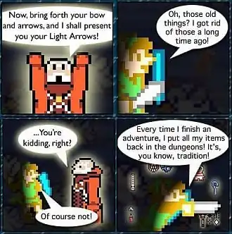 - Lampshaded/justified/something in The Faces of Evil for CD-i. When Link is informed that "it is written" that only he can defeat Ganon, he declares, "Great! I'll grab my stuff!" only to hear Gwonam reply, "There is no time; your sword is enough."