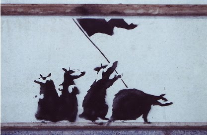 - Weirdness Censor: Banksy, like most graffiti artists, use this to their advantage. There are several photos of Banksy painting in the middle of the day with no one caring.