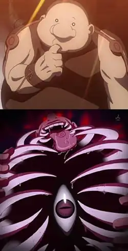 - Pictured above is Gluttony from Fullmetal Alchemist. Of all of the homunculi, he's pretty much the only one who's played for laughs, since he's fat, dumb, and overall acts like a lovable dope. There's also the fact that he's very innocent, and only does what he does because his higher-ups tell him to, and he genuinely doesn't see any wrong in what he's doing. However, as his name suggests, he has a bit of a hunger streak. In the manga and Brotherhood, it's not helped when he's reminded of Lust's death by Roy Mustang's hands, which drives him into the monstrous state also shown above.