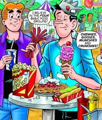 On occasion it can be used as a way to fulfill the needs of many Required Secondary Powers and thus make a character's abilities more believable. For instance, characters with a Healing Factor, Super Speed, or the ability to change shape and size, who would normally have to flout the laws of physics at every turn, can simply explain the extra mass and energy come from over the top eating binges. Magic users in general can have this trope explained because they can cast from their calories. This would explain why mages are often rather thin characters, even though obese wizards aren't unheard of.