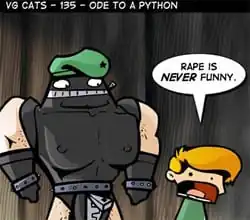 Sometimes it is only the threat of rape that is used. Either way, the facts that rape is more about power than sex, that rape is equally upsetting to the victim regardless of their sexuality and the gender and species of the perpetrator, and that being raped does not determine one's sexuality, are irrelevant here. When it's used as comedy, it's used because it's offensive, or sometimes, in the case of men being raped, because some people refuse to acknowledge men as rape victims. When played with care, rape can also be the subject of very dark humour. Keywords: 'when played with care'.