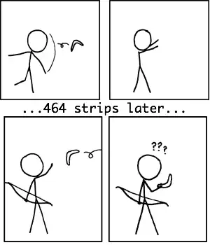 Compare and Contrast with the Overly Long Gag, where the humor is in how long it takes to get to the punchline. See also Late to the Punchline, which is where a character who doesn't get a joke finally gets it, making it a kind of Brick Joke for that character. The Flying Brick, however, refers to something else entirely. See also Call Back and If It Was Funny the First Time.