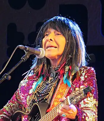 Buffy Sainte-Marie (February 20, 1941 – ) is a singer-songwriter who performs in the folk, country folk, rock, and electronic genres, and is also a professional actress. She is Cree by adoption, and is a member of the Piapot First Nation; this doesn't stop both Canada and the USA claiming her as their own. Among her many honors, Buffy Sainte-Marie is the first Indigenous American / First Nations person to win an Academy Award.[1]