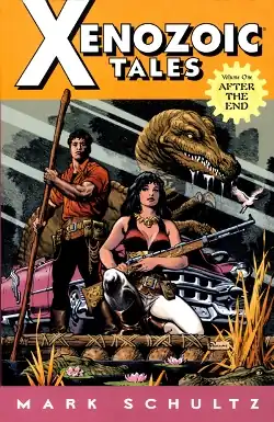 The world first appeared in Death Rattle #8 in a short story called Xenozoic! which introduced the characters and concepts. This was rapidly spun off into its own series under the name Xenozoic Tales, which premiered in February, 1987 and ran through issue 14, published in October 1996. Never officially canceled, creator Mark Schultz (not the Christian singer) still insists he'll be getting issue 15 out at some point. Don't hold your breath. Issue 14 didn't show up until two years after issue 13, largely due to the lushly detailed artwork Schultz drew. It's somewhat better known under the label "Cadillacs and Dinosaurs", which was the title of the first trade and rapidly supplanted the actual title in the minds of many fans.