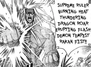 - While the series is normally full of attack-calling, the trope is parodied by Jack Rakan, who invents then charges absurd amounts for new, unique Finishing Moves. One of his ideas for Negi is "Extreme Ruler Burning Heat Thundering Dragon Erupting Flash Demon Tempest Rakan Fist", which he immediately discards for being too long to use in a fight.
