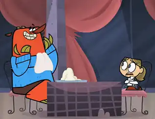 - On Jimmy Two-Shoes, when Beezy is under the influence of a Love Sweater meant for Jimmy, he drags Heloise on a date, and ends up wrapping her in a straitjacket to enjoy a candlelight dinner.