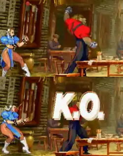 - ↑ counts as a throw, fairly difficult to pull off, does minimal damage because it involves jumping on the opponent and licking them repeatedly for a second or two