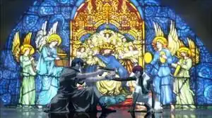 Commonly seen in Heroic Bloodshed movies and Anime, causing much Values Dissonance among the Westerners. May involve a Church Militant or two but it's not mandatory. Bonus points if Ominous Latin Chanting with religious lyrics are added. Double bonus points if there are doves flying around during the mayhem. Scenery Porn may be a factor when the building is particularly ornate or the stained glass itself is given particular attention.