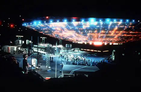 - Originally the mothership was supposed to be hugely impressive but a bit menacing. In fact, Trumbull was about to get all Freudian and have the underside of the ship resemble a giant breast. Then Spielberg, filming in India, drove six nights in a row past a gigantic oil refinery that was all lit up in a million colors, full of interesting antennae, walkways and pipes, and the "city of light" was born. Bless you, Bharat Petroleum. Thank you.