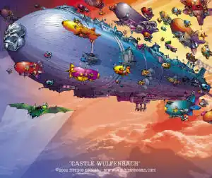 - The page image is Castle Wulfenbach, mobile fortress, administrative center and war machine of the Wulfenbach Empire in Girl Genius. It's roughly a kilometer long, has an entire fleet of additional airships to support it, and some of the people who work there haven't set foot on the ground in years.