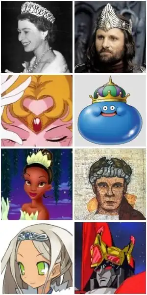 - ↑ Left to right, top to bottom: Queen Elizabeth II, Aragorn, Sailor Moon, King Slime, Tiana, Claudius, Sapphire, Starscream.