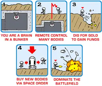 Mine precious gold from the deformable pixel terrain in order to buy more and better ships, soldiers, weapons, digging tools, and deployable defenses. Use these assets to defend your disembodied brain and bankrupt your opponent! Old-school 2D sidescroller pixel graphics coupled with an extremely detailed physics simulation makes for a mix of nostalgia and surprising gameplay.