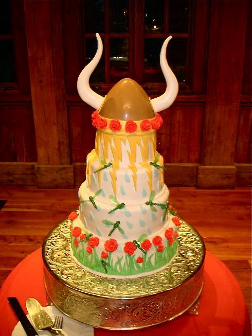 Dragonflies, roses, lightning, and a viking helmet? Admit it: you wish you were invited to this reception. |