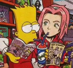 - The Bart Simpson/Sakura Haruno picture shown above, which came from Nickelodeon Magazine. For a few years, they wrote a fake magazine called "Toon People" which focused on the social aspects of characters from various shows and networks. Other pairings that were shown in said magazine included Naruto/Lisa Simpson, Aqualad/Katara, Zuko/ Kim Possible and for some odd reason, Snow White and Belle getting a makeover from Flapjack.