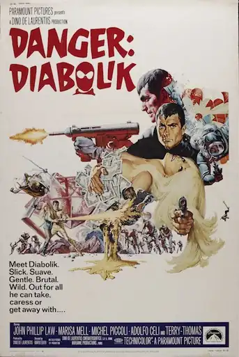 Not so-gentlemanly thief Diabolik (John Phillip Law, of Barbarella and Space Mutiny fame) terrorizes the European countryside, killing, maiming and stealing to satisfy the mercurial whims of his girlfriend Eva, all whilst dodging semi-competent Police Inspector Ginko. For Eva's birthday, Diabolik determines to steal an exquisite emerald necklace from some rich old toddy. Unfortunately for him, it's a cunning trap set up by Inspector Ginko. Doubly unfortunate, the European criminal element has united under mob boss Valmont in order to capture Diabolik. Will Diabolik escape the two-pronged trap, or will Ginko finally get his man? Will Valmont play the hero? Will Eva survive her experience in the Infrared Room? And what of Diabolik's plans to swim through the center of the sun?