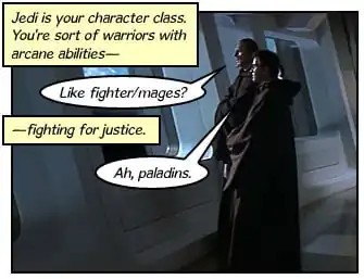 • Sure Why Not: Half the plot is based on this, thanks to the GM's free hand with his players' inventions. It's used verbatim when Qui-Gon comes up with a patently ridiculous explanation of the Force involving midi-chlorians, and when Sally invents, off the top of her head, The Dark Side. Conversely, it's used by Jim when the other players assume Padmé is pregnant after some very vague roleplaying.