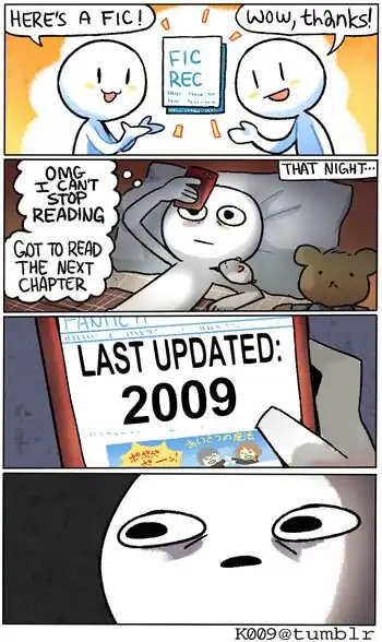 A fic whose chapters are spaced with wider updates each time. While this may be the result of a writer working for an overall better product, there is a higher chance of the writer getting derailed by work or personal life. Eventually the fic stops updating, and the reader is left wanting. The death knell comes when, rather than simply coming out with a new chapter, the author just assures the audience they haven't given up. Although the fic in question may update again - sometimes just so the author can state outright that it's a Dead Fic or on Permanent Hiatus. (Or in that matter leaving a note at the end of a chapter and telling what was supposed to happen.)