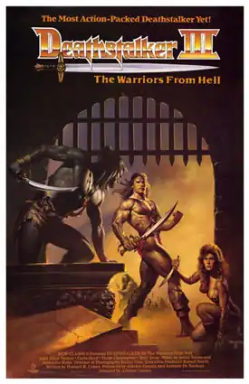 - Covers Always Lie: While the above cover artwork is a good Boris Vallejo piece, the Barbarian Hero doesn't look a thing like Deathstalker in this movie. Nor do any of the heroines resemble the kneeling Hot Amazon. And we never get to see our hero fighting monsters creeping out of coffins, as we do here.