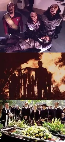 A wide variety of practices are possible, as in Real Life. Cremation and burial are the most common, but such practices as exposing to the dead to vultures and other unusual methods can be done in fiction as in life. Even slicing up the body—usually regarded as mutilation and proof of evil—has been done in Real Life as a means to free the soul from the body and has featured so in fiction. Preserving parts (usually bones) of the dead can be the mark of a Necromancer or of respect, depending on how used; see the Sub-Trope of Dead Guy on Display.