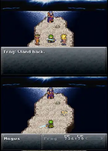 - In Chrono Trigger, if you choose to fight Magus in his second appearance with Frog in your party, Frog will send the other party members away for the fight because he wants to defeat Magus himself. In addition, Robo vs. Atropos, during the Geno Dome Sidequest.