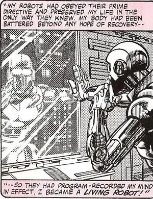 "I'm afraid I didn't land very well. Fortunately I had programmed my earliest robots to save my life at any cost! They found me in a lonely alley before the spark of life had fled. [...] I shall never forget the sight that greeted me upon regaining consciousness! [...] I remember I felt well -- even strong -- although I had this incredible sense of detachment. And then, I lifted my hand to my face... but it was no longer my hand!" —The Machinesmith, Captain America # 249