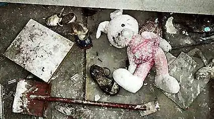 rebelliongenocide was the "accidental" shooting of an Ishvalan child by an Amestrian officer (though it was really done on purpose by a shapeshifting Envy), after a lot of tension between the Amestrian government and the Ishvalan people. When this is said in a voiceover, we're shown a small, limp and bloodied arm (the rest of the body is offscreen) with the token teddy bear next to it.- Also, in Fullmetal Alchemist: Conqueror of Shamballa. The doll usually appears in piles of debris from a collapsed building, so that we know that a child has been killed without actually showing a crushed, mangled child, for obvious reasons.