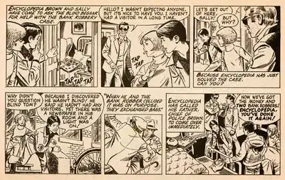 In addition to these, there have been fifteen or so Encyclopedia Brown's Book of X books, covering topics from trivia to cars to crime history. It was also adapted as a comic strip (for a sample of which see the page image), which was syndicated by Universal Press Syndicate and ran from December 3, 1978, to September 20, 1980.