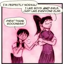 - El Goonish Shive is a funny case, since characters who have been genderbent by Tedd's TF Gun develop a temporary attraction to the opposite gender. Depending on how you look at it, between one and two characters are naturally bisexual (Ellen is an Opposite Gender Clone who has all the memories of her original male heterosexual self, and hasn't fully come to terms with the fact that she's attracted to guys as well as to girls. Grace is "Teddsexual" regardless of Tedd's current gender.), but seven of them have been genderbent, and of those the four straight ones have all had to deal with attraction to both genders. (Justin and Nanase are exempt from this due to being naturally gay—when genderbent, they just get even more attracted to guys and girls, respectively.)