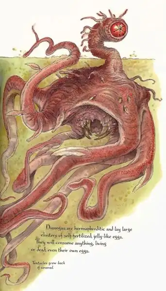 - The Magic World of Mahou Sensei Negima has the pseudo-octopus called Cerberus Cloth Eater, which only eats and dissolves your clothes, but is still greatly feared by travelers since it licks them thoroughly then leaves them naked in the jungle. Poor Chisame encountered one.
