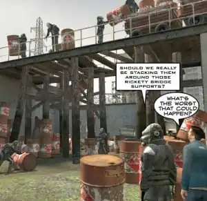 - Not only does the main character accidentally order 100,000 explosive barrels for the Combine instead of just 100, thus explaining their abundance, but the Combine soldiers are specifically instructed to stay near them.[1]