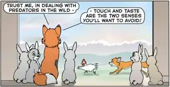Many story arcs deal with the result of Randy's sheltered upbringing; he's innocent and gullible, can't avoid traps or track scents, doesn't eat his fellow animals, and has no idea how to treat Cindy, the wild vixen he has a crush on -- or Dusk, the less scrupulous wild vixen who has a crush on him.