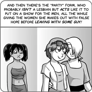 One of the most common flavors is when two girls start kissing and acting a little too friendly just for the sake of gratuitous titillation, which in real life is known as "club lesbianism" due to party girls often doing this at the Coolest Club Ever.