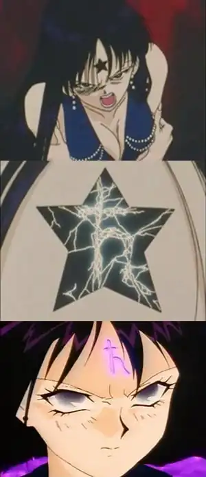 - Pictured above: Hotaru in Sailor Moon when she's possessed by Mistress 9. She finally triumphs and burns her away from the inside. The visual of the Saturn symbol breaking through the Death Busters' star is brilliant.