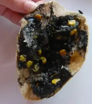 The planet Earth is a very diverse place, with many different cultures, each of which has its own traditions, history, worldview, and menu. For the hapless traveler, encountering a new and very different food can be an unsettling experience of the Squick-tastic variety. This is very much Truth in Television, and often finds its way into fiction as well, where it is usually played for laughs. Plus, it's an easy challenge for a Reality Show to pull off. (For example, pictured here is huitlacoche, corn grains infected with corn smut, a true Mexican delicacy!)
