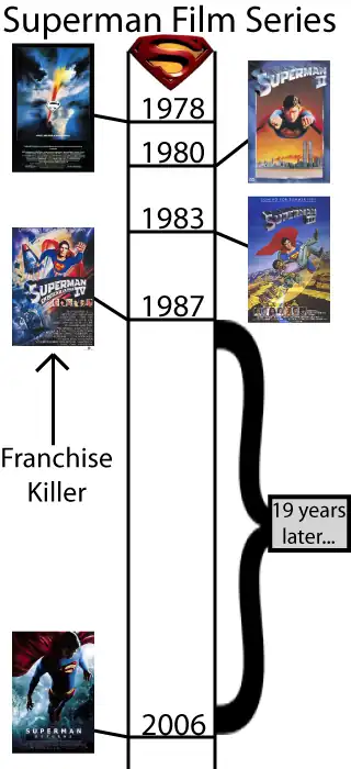 - Superman III was bad. Superman IV was in some ways an improvement; but where it did go wrong, including glaring Special Effect Failure, it broke Willing Suspension of Disbelief. The series went comatose for nearly twenty years and when it came back, Superman Returns was a sequel to Superman II and ignored the continuity of Superman III and Superman IV. Returns was decent (even taking into account the Broken Base), but didn't perform well enough to keep the franchise resurrected without another reboot.