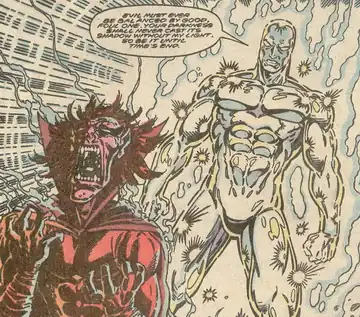 - The page image comes from a What If Silver Surfer story. Mephisto finally manages to acquire Silver Surfer's soul and brings him into Hell. He realizes too late that the Surfer's soul is so good and pure that its light hurts him. Since Surfer already agreed to be in Hell forever, Mephisto will burn "until time's end".