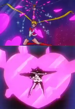 - A Sailor-suited Pretty Soldier of Love and Justice: Sailor Moon! - her attacks are the only ones that purify their opponents. Also Moon Spiral Heart Attack (the page image) and Rainbow Moon Heart Ache slam her opponents with a giant heart that shatters on impact.