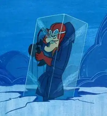 This may also apply to characters who have fallen into cold water and come out in a block of ice; if the water isn't cold enough to have frozen already, then, once again, where does the ice come from? Note also that the block of ice in question has the strange tendency to come out in the shape of a perfect cuboid.