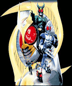 - Mythology Gag - Not only is Another Agito's design meant to invoke the Showa Kamen Riders (it even comes with a Scarf of Asskicking of sorts), but his motorcycle resembles the one used by Kamen Rider Black.