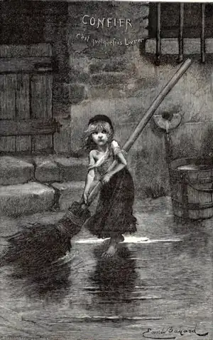 - Barefoot Poverty: Several illustrations, including the most famous one centering on Cosette (see above). Justified, considering that a lot of it (aptly titled "The Miserable Ones") focuses on 19th century France, which wasn't doing all that hot.